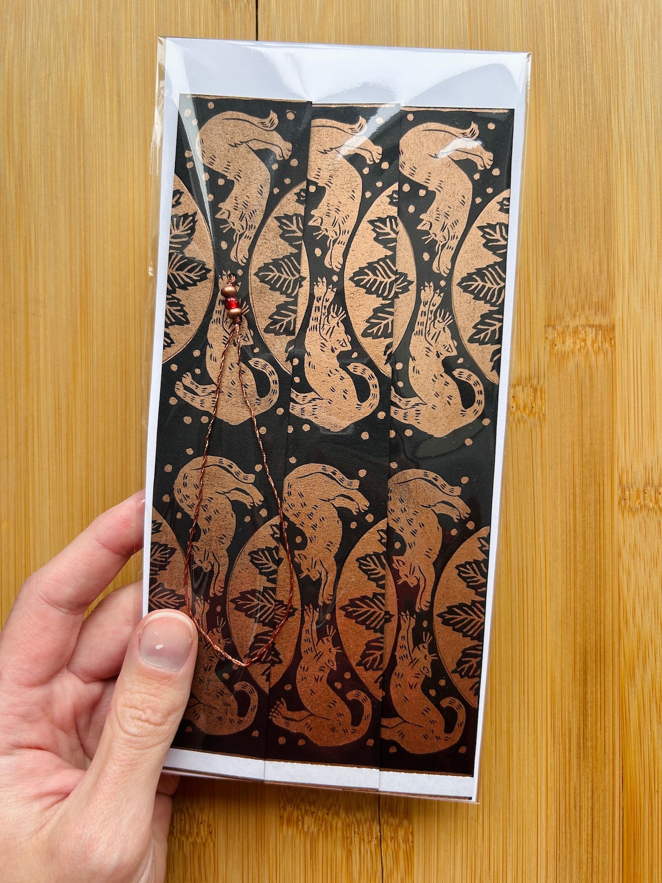 Metallic copper ink on black cardstock. Metallic string with glass beads is already affixed to the pattern. Colour of beads may be different than pictured.