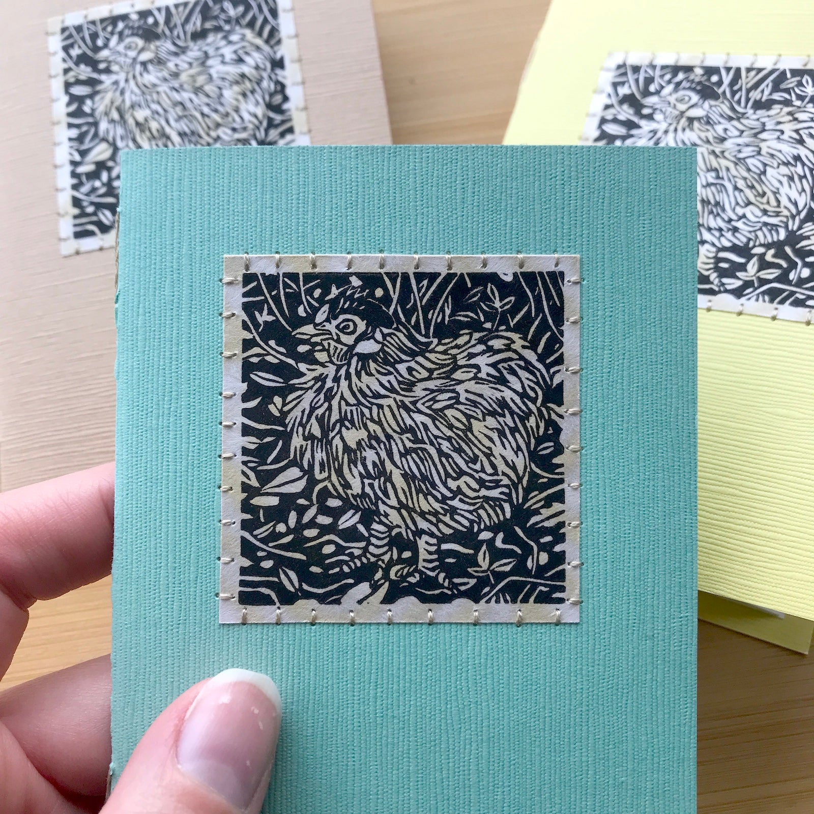 Linocut print of a chicken, with a hand stitched border, on linen cardstock. There is a blank off-white liner paper stitched inside.